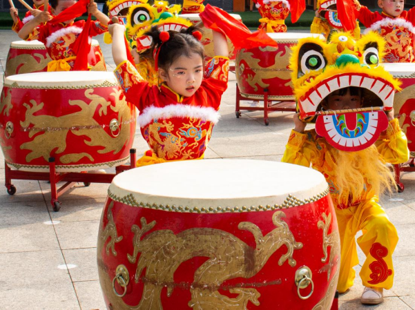 國家能源集團愛心幼兒園的孩子們表演打鼓、舞獅 (朱澤雅 攝)