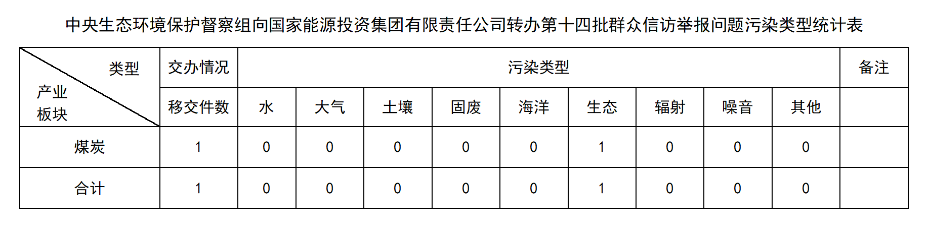 12月10日,中央第五生態環境保護督察組向國家能源投資集團有限責任公司移交第十四批群眾信訪舉報件1件,其中來電1件、來信0件。本批信訪件涉及生態環境問題1件,其中生態1件。