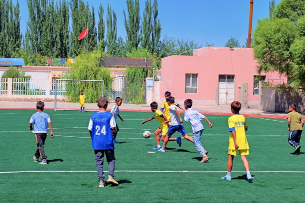 圖為孩子們?cè)谛滦藿ǖ牟賵鎏咦闱?/p>