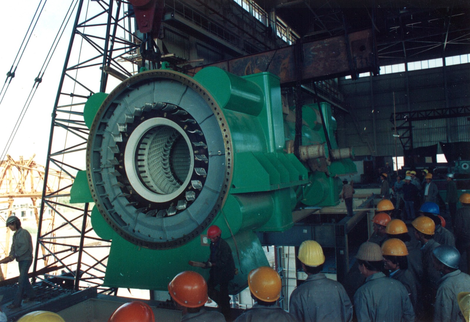 圖為1號機發電子定子吊裝就位情景