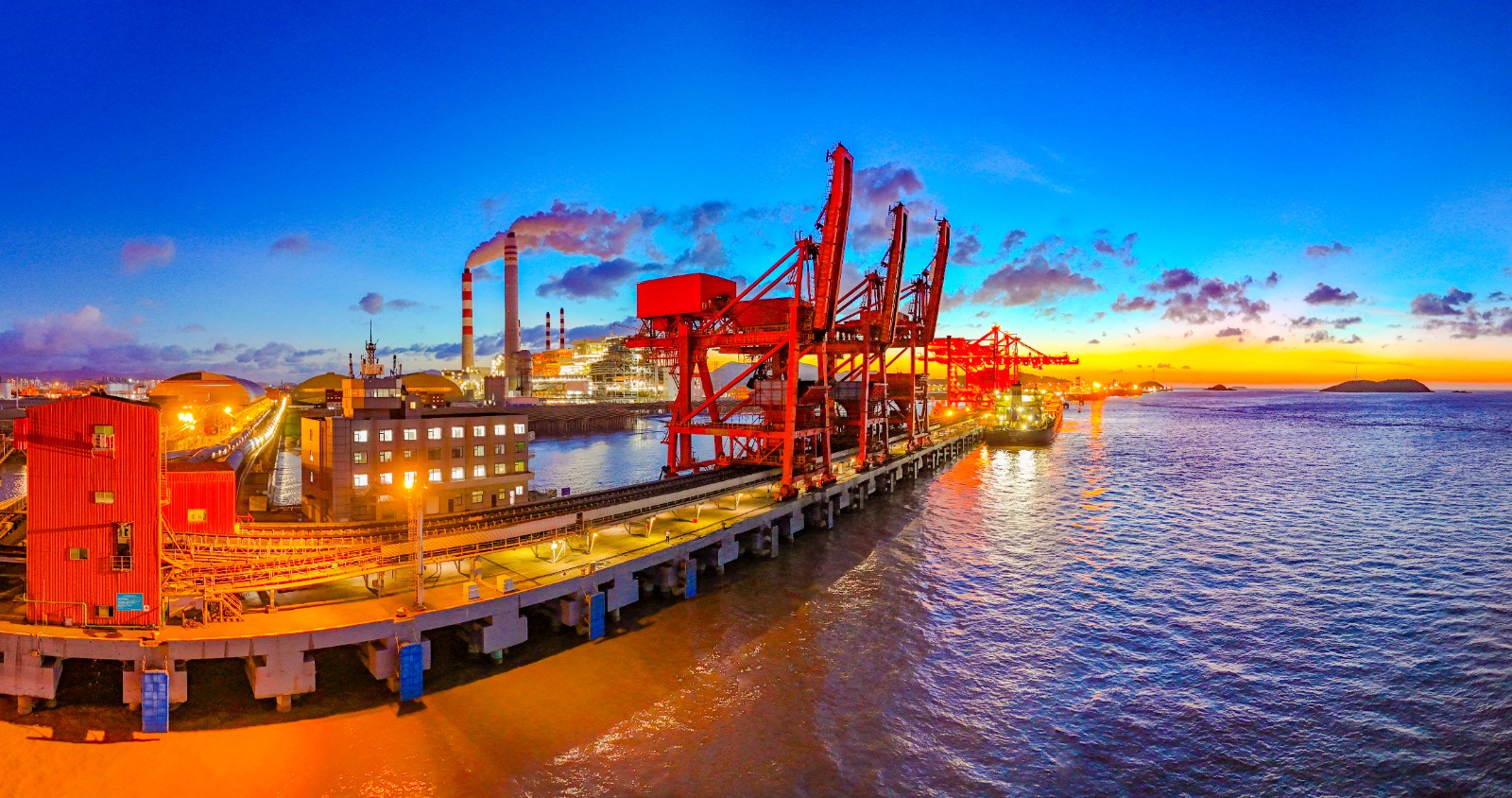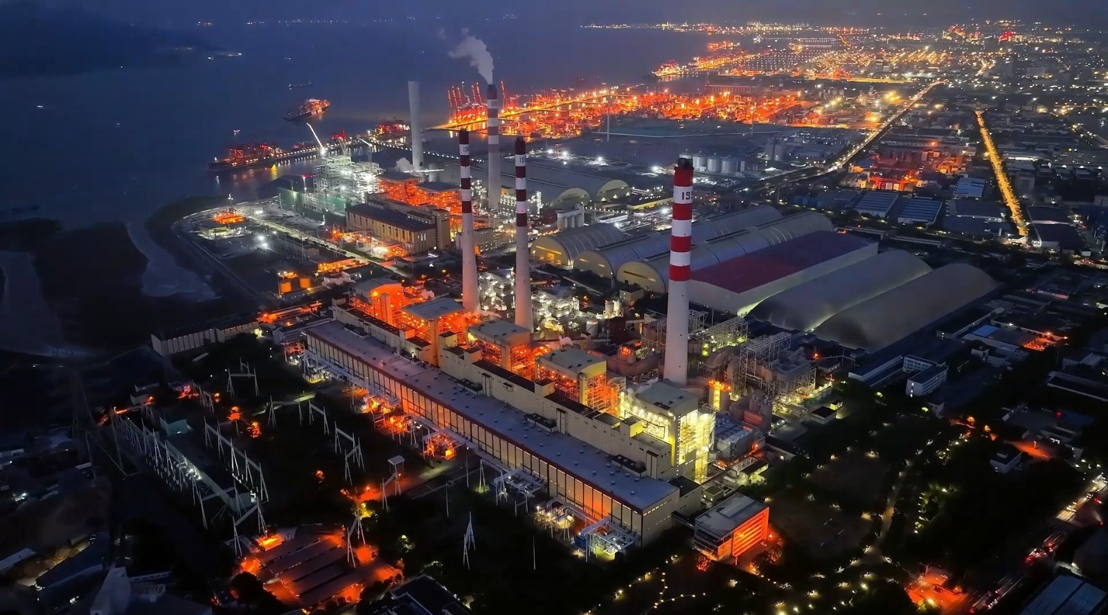圖為夜色下的北侖電廠與北侖港