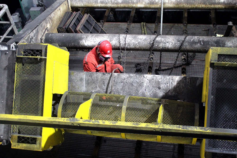 圖為職工正在拆卸351精煤篩舊篩板