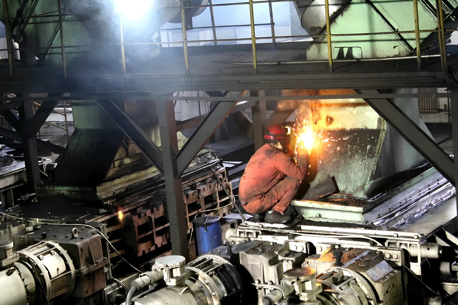 圖為焊工正在對244破碎機上溜槽裂口進行補焊