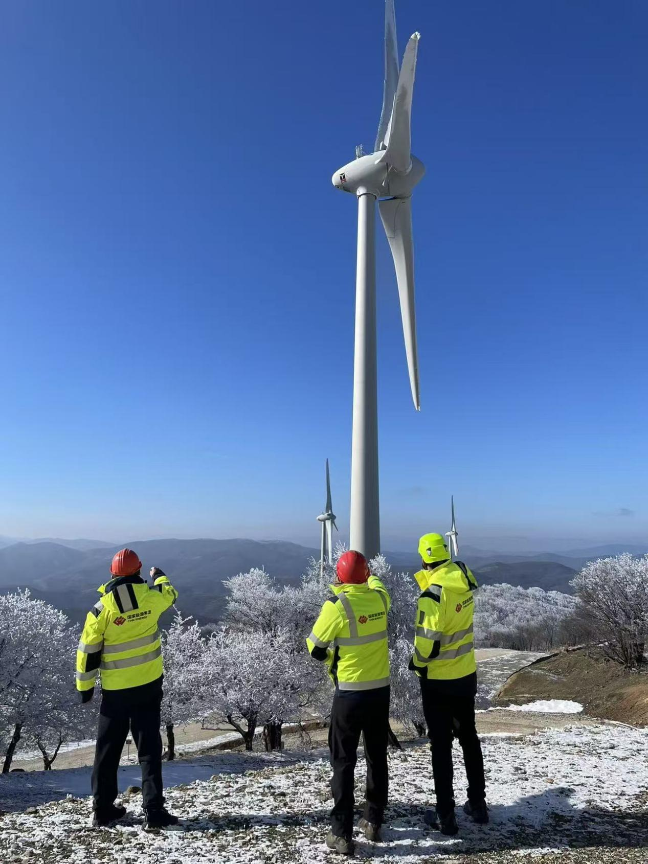 此時,遠在希臘最北邊色雷斯風電場的希臘籍工程師塔夫羅斯、尼科斯、喬爾戈斯從現場發來照片和問候:因山區寒冷天氣造成的風機結冰問題已經處理,請公司放心,祝大家馬年吉祥!
