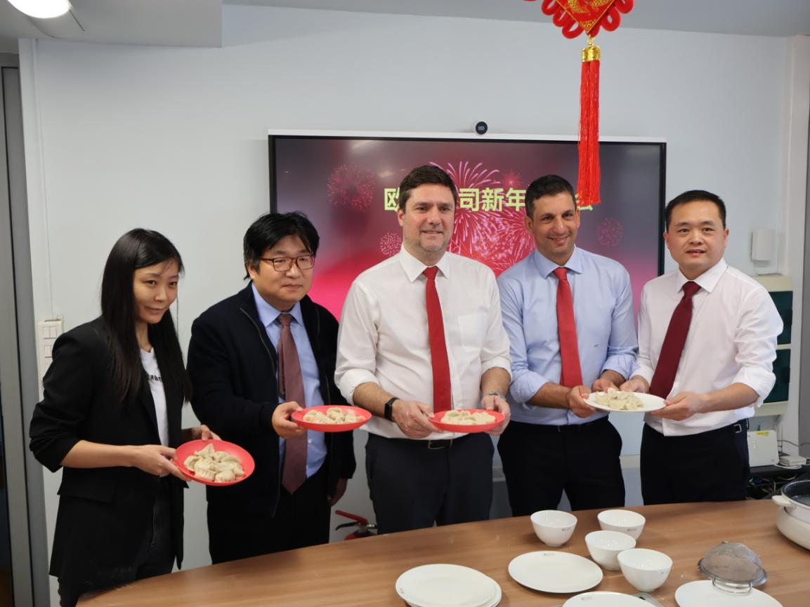 這場“中希餃子宴”就這樣歡快地進行著,僅半個多小時大家就吃上了熱騰騰的餃子。巧合的是,歐洲公司在希臘的合作伙伴科佩洛斯集團此時也在樓內舉辦慶祝活動,雙方互贈蛋糕和餃子作為新年祝福。跟中國的傳統做法在餃子里包硬幣一樣,希臘人也會在蛋糕里裹入硬幣,誰能吃到硬幣就是新年最幸運的人。中希兩國文化有太多相似的地方!