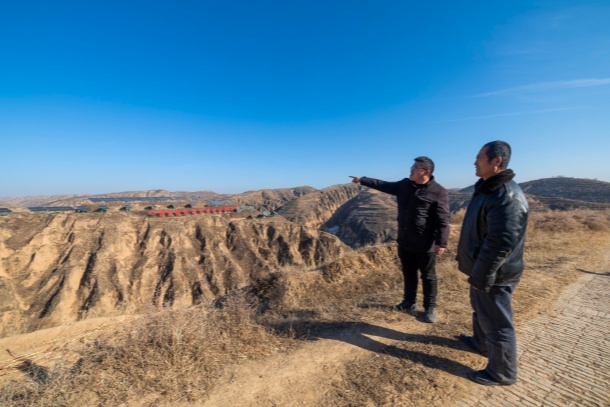 圖為高西溝村黨支部副書記高利東正在和村民一起瞭望遠處的光伏板