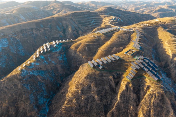 冬日,米脂縣楊家溝與高西溝的山峁間,盡是溝壑縱橫的蒼茫,就在這一片蒼茫之中,一排排深藍色的光伏板錯落有致地鋪展在山坡上,在冬日暖陽的映照下熠熠生輝。