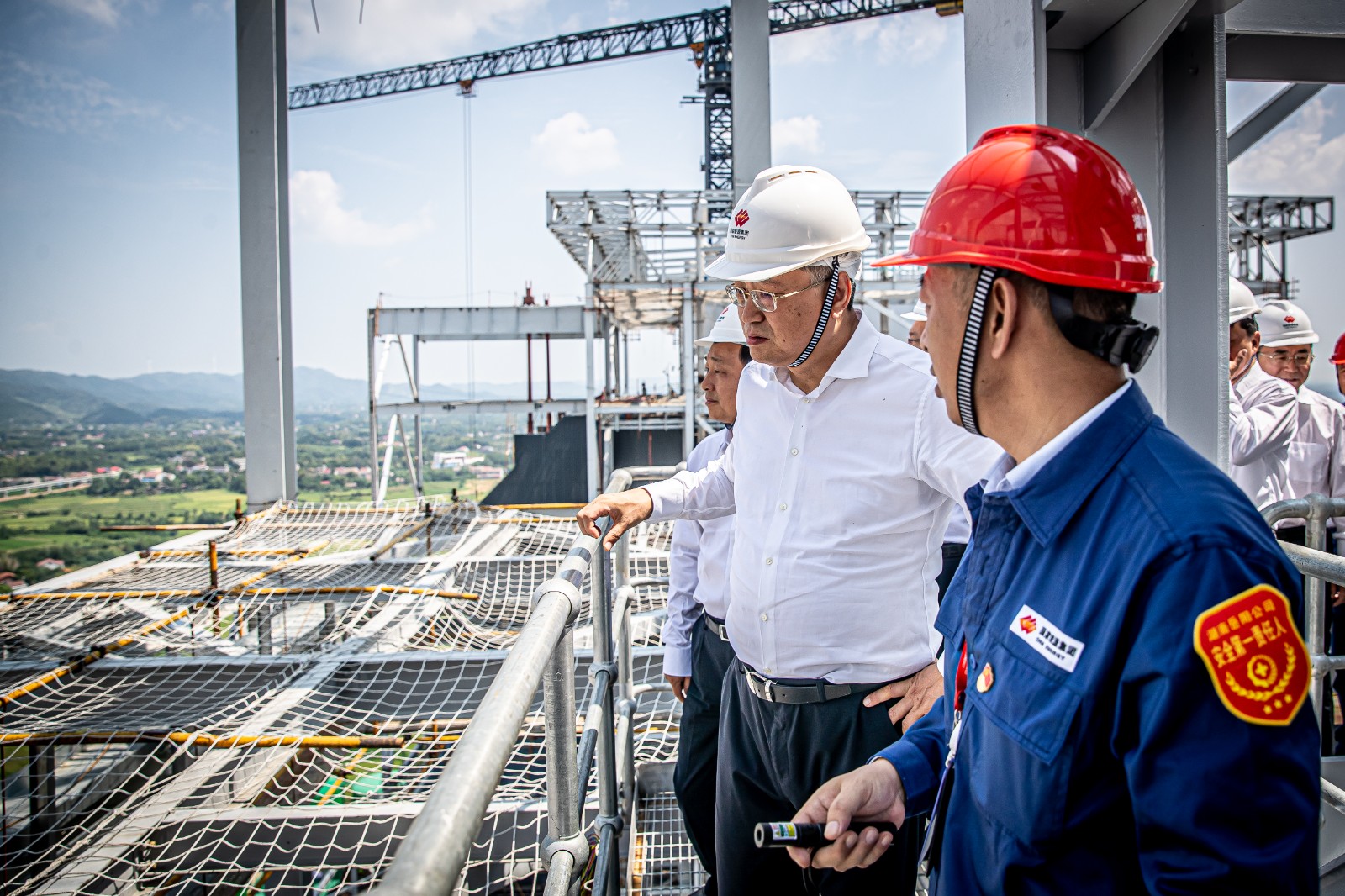 劉國躍在岳陽電廠察看鍋爐107米平臺施工情況
